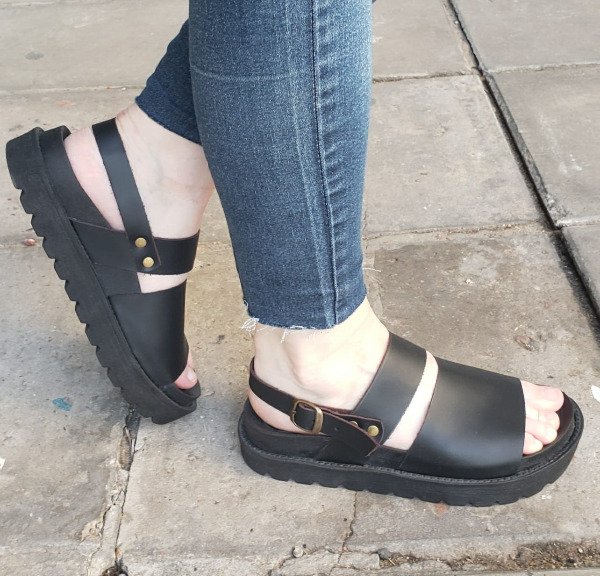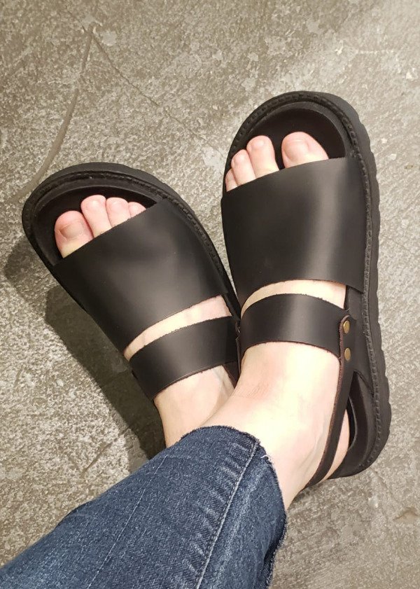 Sandalia de cuero vacuno modelo fajas , Cuero color negro . Base con Suela doble plataforma super mullida y cómoda .
